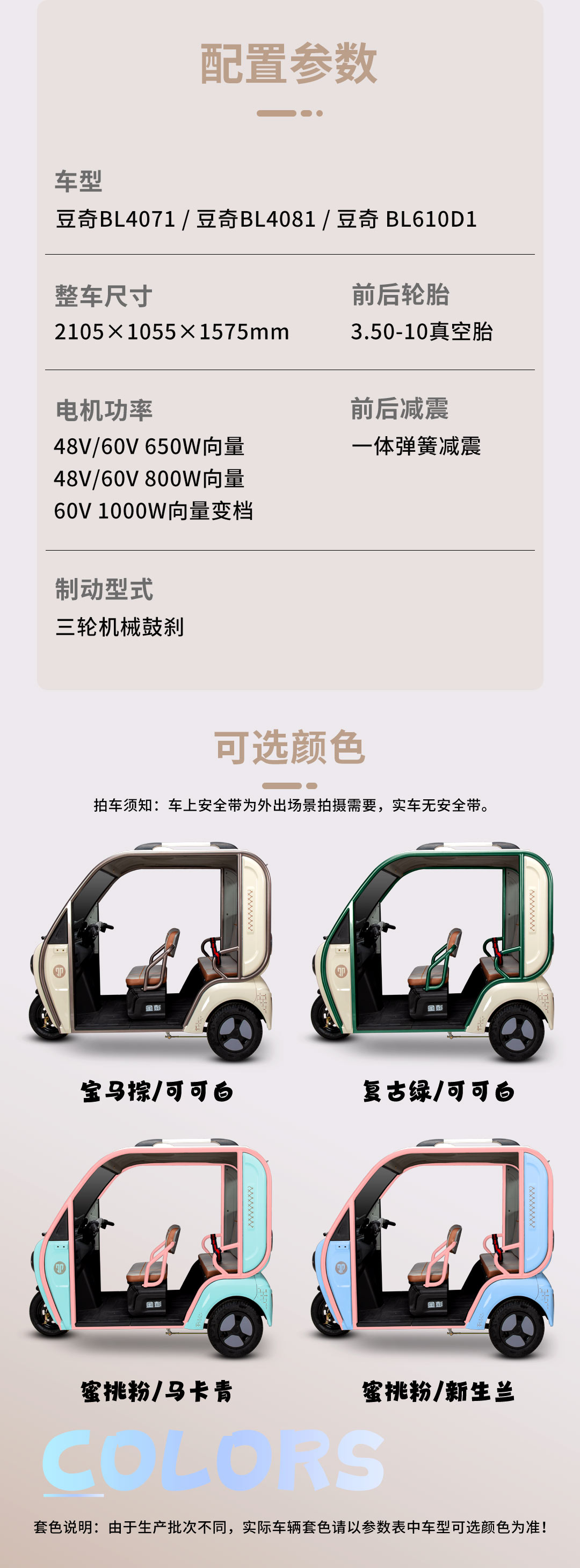 Pink/White、WhiteL×W×H(mm) 2055×1065×1625 2055×1065×1625 Wheel base(mm) 1520 1520 Wheel track(mm) 890 890 Minumum ground clearance(mm) 130 130 Minimum turning radius(m) 3 3 Curb weight(kg) 232 232 Max speed(km/h) 25 25 Max slope of climb(%) 15 15 Battery lead-acid:48/60V-45AH lead-acid:48/60V-45AH Motor. electric power control(w) 650 800 Driving mileage at efficient speed(km) 50 50 Charging time(h) 6-8 6-8 Body structure 2doors 3seats 2doors 3seats Front shock absorber Hydraulic shock absorption Hydraulic shock absorption Rear shock absorber Steel suspension Steel suspension Front/Rear tyre 3.50-10 Tubeless 3.50-10 Tubeless Rim type Iron Iron Front/Rear brake type Front/rear drum Front /rear disc Paking brake Handbrake Handbrake Glass lifts Hand lift Hand lift Seat Front foam/rear pearl cotton fabric seat Front foam/rear pearl cotton fabric seat 40HQ CBU 14 units 20GP 5 units