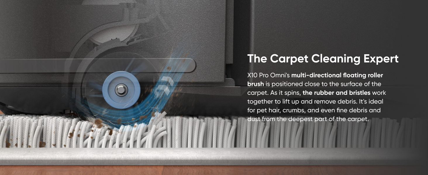 [𝐏𝐨𝐰𝐞𝐫𝐟𝐮𝐥 𝟖,𝟎𝟎𝟎 𝐏𝐚 𝐒𝐮𝐜𝐭𝐢𝐨𝐧 𝐟𝐨𝐫 𝐚 𝐃𝐞𝐞𝐩𝐞𝐫 𝐂𝐥𝐞𝐚𝐧] X10 Pro Omni effortlessly removes hidden debris in carpets, including pet hair, for clean floors in just one pass.