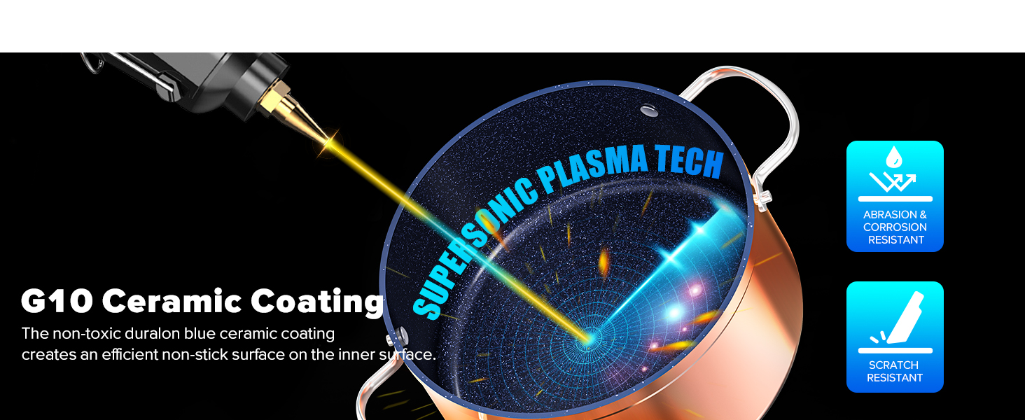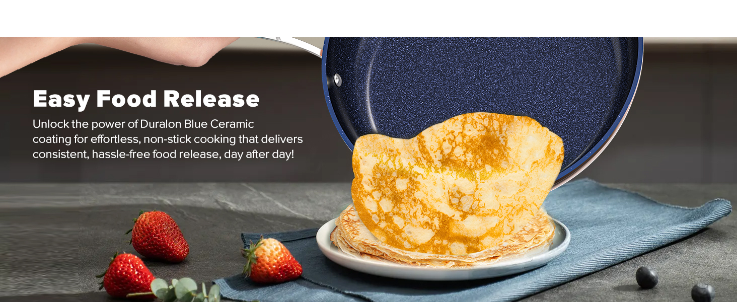 GENERATION 10 (G10) CERAMIC – For more than a decade, we have continuously perfected our Duralon Ceramic Coating. G10 Duralon Blue is exceptional in every category. It heats fast and evenly; releases food effortlessly; and is extraordinarily durable.