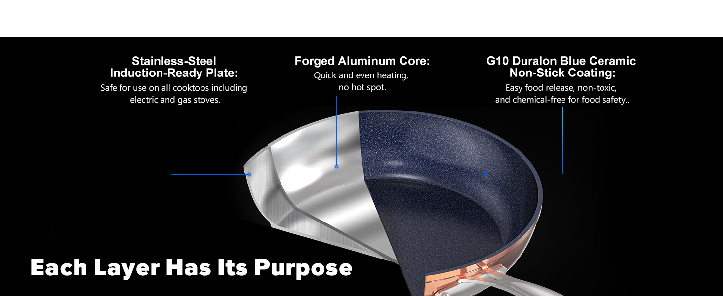 HEALTHY DURALON BLUE COATING – The eco-friendly, ultra-non-stick Gen10 Duralon Blue is all-natural ceramic coating free of harmful chemicals like PFAS*, PTFE, PFOA, lead, and cadmium. It also does not emit toxic gases at higher temperatures. *Tested by TÜV Rheinland for 106 known PFAS elements and none were detected.