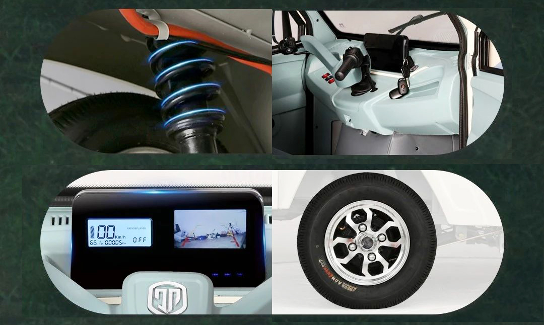 LxWxH(mm): 2500x1195x1660 Body structure: 5doors 3seats Minumum ground clearance(mm): ≥150 Curb weight(kg): 332 Steering type: Handlebar type Max speed(km/h): 30 Grade ability(%): ≤10 Battery: 60V 45AH Motor Controller: 60V 1000W Range per charging(km): 50-60 Chargingtime(h): 6-8h Rear brake: Shock absorption