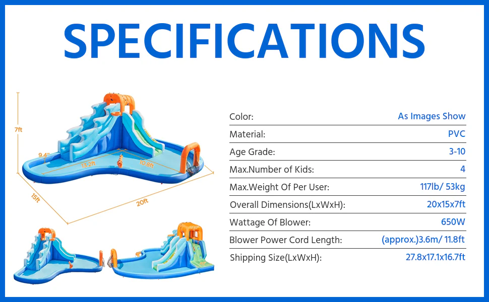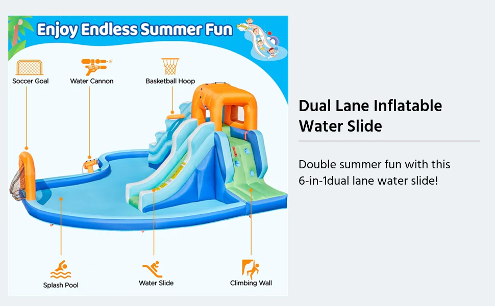Dual Lane Inflatable Water Slide For Kids Aged 3 To 10. 6-in-1 Giant Water Slide Combo W/ Storage Bag & 650 W Blower. 2 Long Slides & Large Splash Pool & Water Cannon & Soccer Goal & Basketball Hoop & Climbing Wall. 20′ L x 15′ W x 7′ H