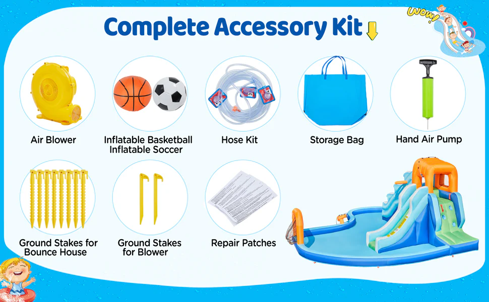 • 【Complete Water Slide Set】This water slide set comes with everything you need to build a perfect backyard fun center – a double-lane water slide with a splash pool. an ETL-certified blower. a storage bag. a basketball. a soccer ball. a hand air pump. a water hose. a repair patch kit. 6 plastic rings. and 10 ground anchors.