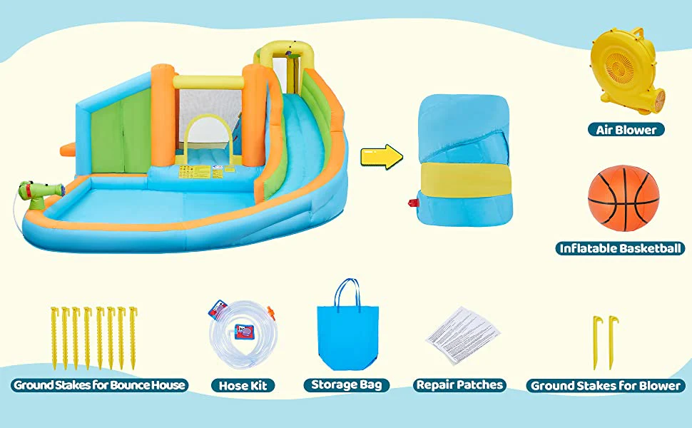 - 【Large Inflatable Combo With 8 Fun Features】This inflatable bounce house not only has classic features like the bouncer. large splash pool. climbing wall. tunnel and the curved slide but the water cannon. basketball hoop and cute pretend play market stand take the game to the next level.