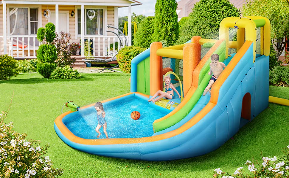 - 【Well-rounded Private Water Park For Kids】This 8-in-1 water bounce house ensures you and your kids hours of fun in the backyard. It features a large pool area. a slide. a water cannon. a climbing wall with footholds. a bouncer. a basketball hoop. a tunnel. and a cute market stand for pretend play. Suitable for 4 kids aged 3 to 10 (with 99 lb maximum weight for each kid).