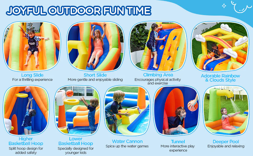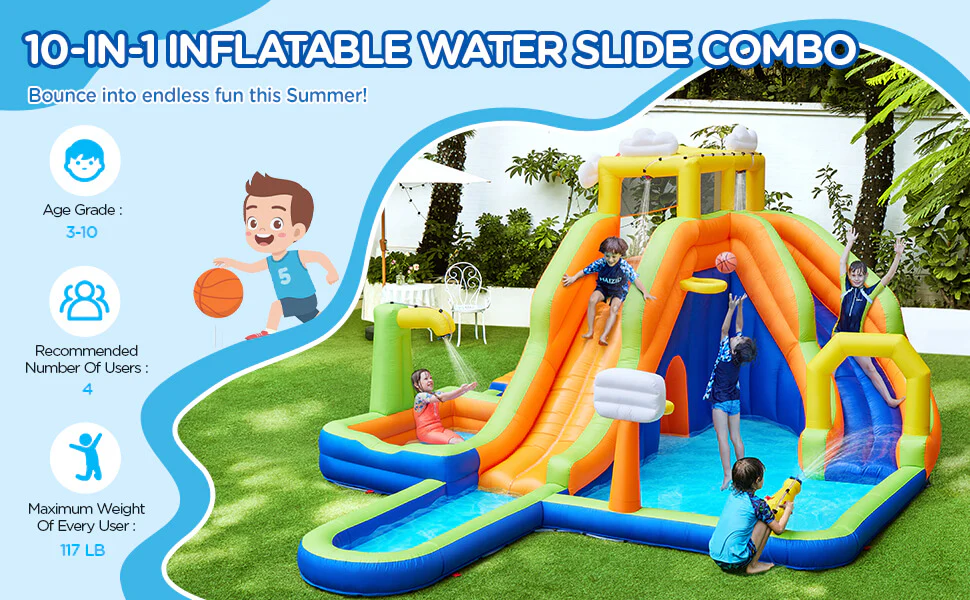 - 【Exciting Water Adventure】Prepare for endless fun with our double-slide inflatable water park! Packed with thrilling features like 2 water slides. a spacious splash pool. a small deeper pool. 2 basketball hoops. a water cannon. a tunnel. and a large climbing wall. it offers non-stop excitement for kids.