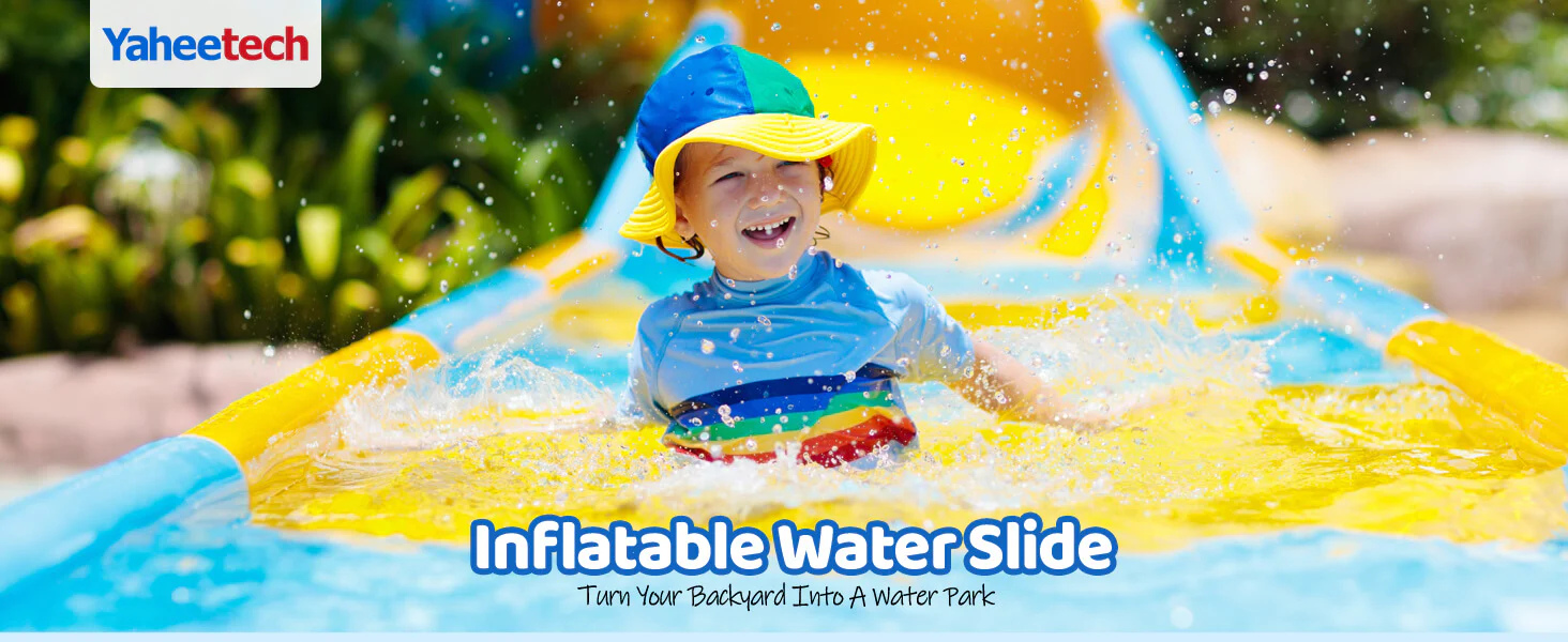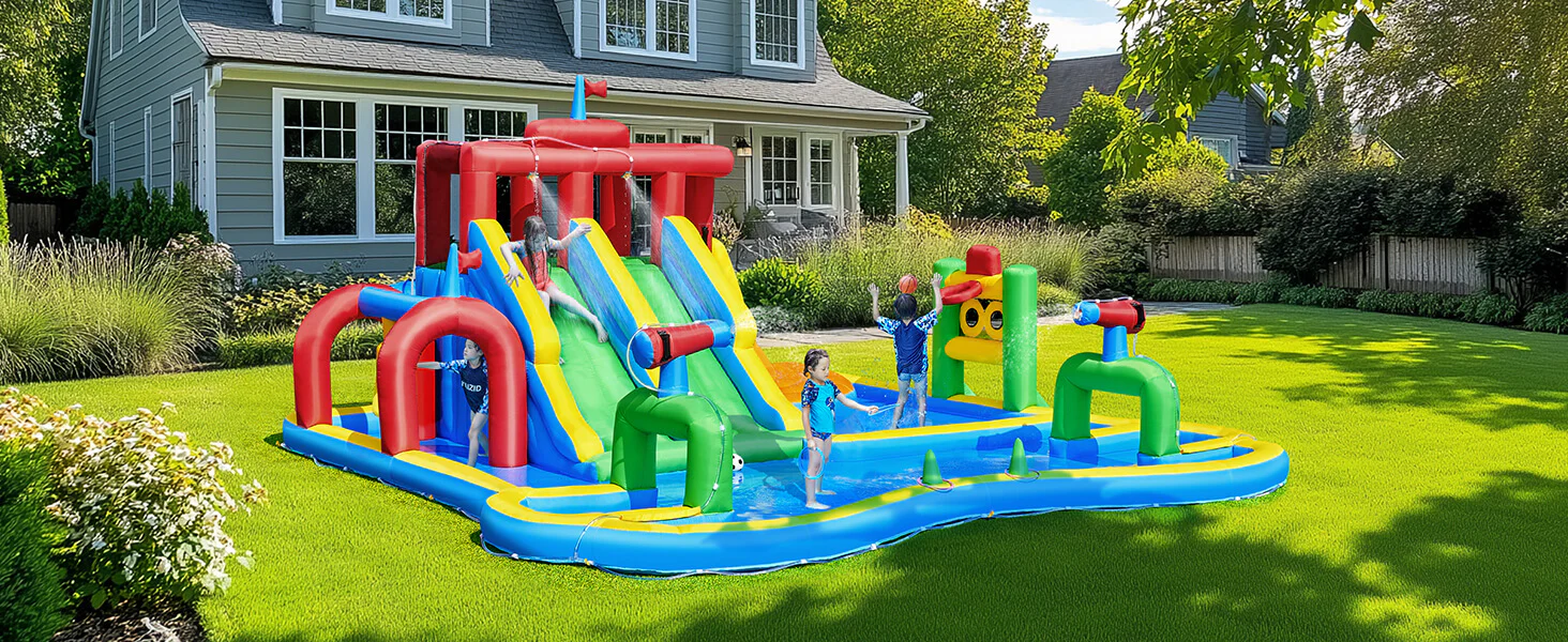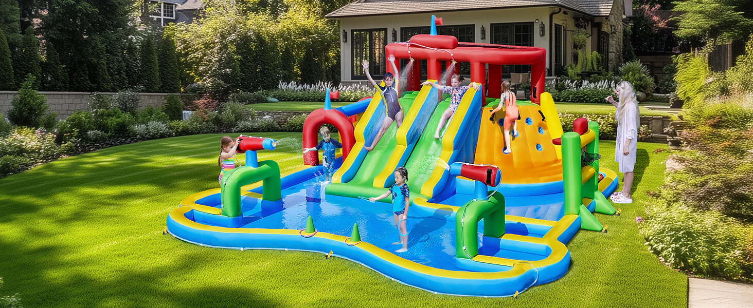 - Nonstop Thrills for Kids: This action-packed inflatable water slide features two slides. a climbing wall. a mini soccer field. and water cannons. Kids can dash through the tunnel with punching bags. shoot basketball. and enjoy ring toss and ball toss games.